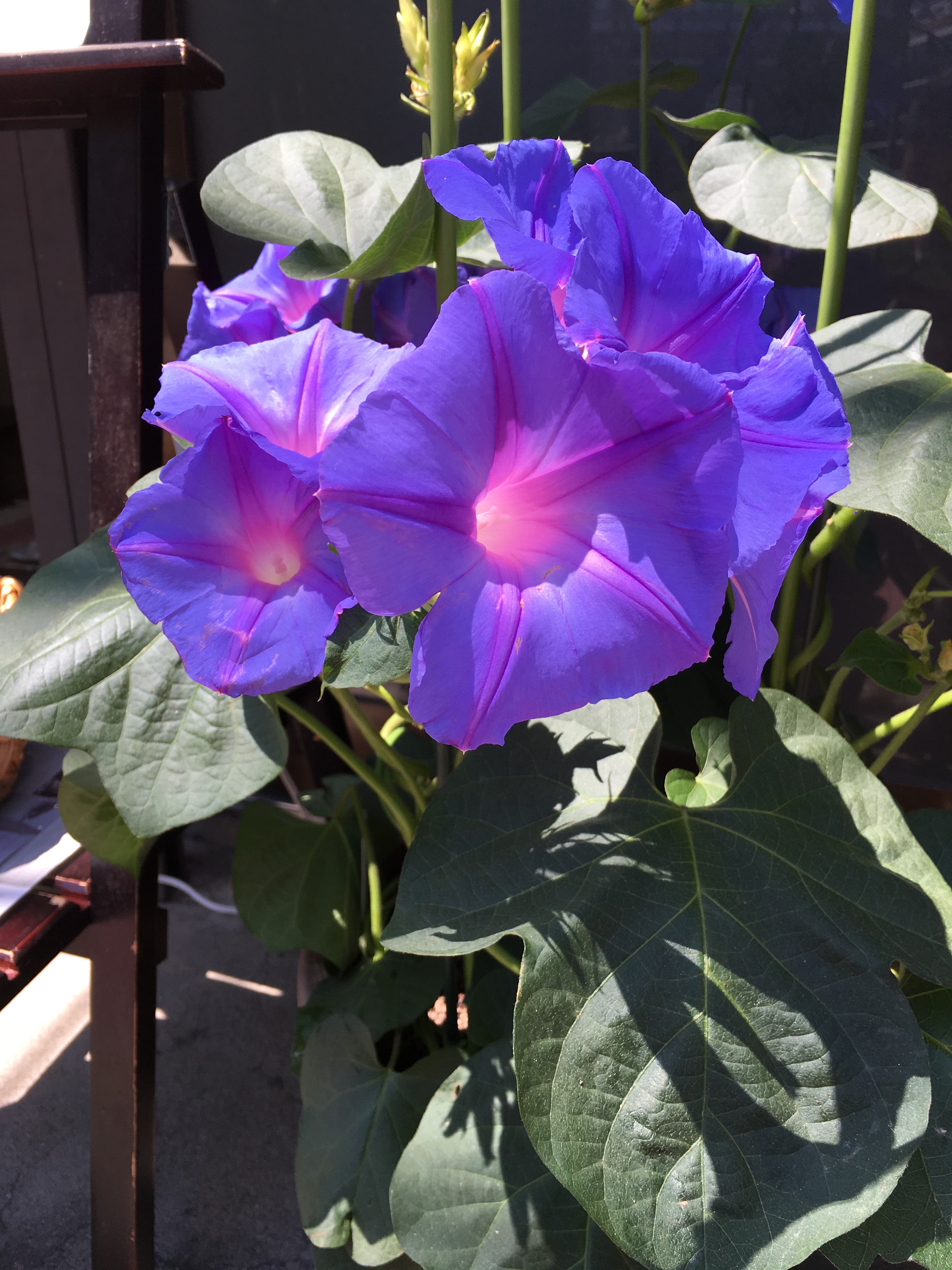 普通の朝顔はつるから蕾が一つ出てきてそこに花が咲くのですが、この琉球朝顔は蕾の塊が出てきてそこにこのように蕾が7-8個固まって花が咲きます。
