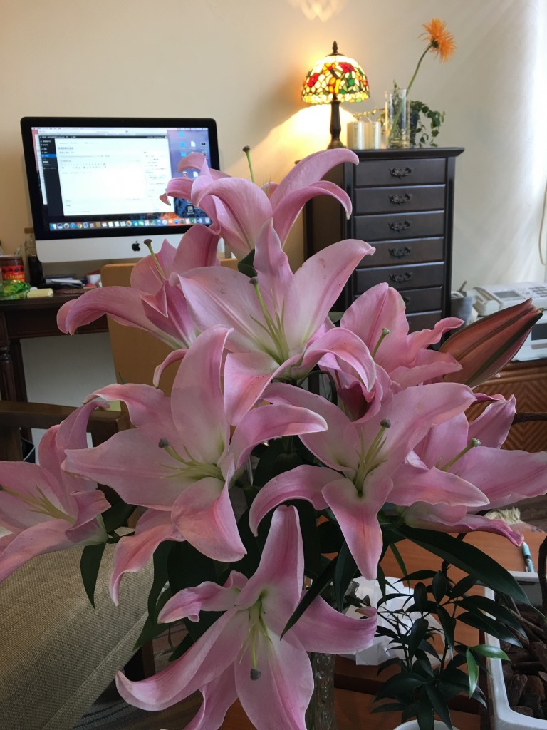 これだけ百合が咲いていると豪華ですよね、もちろんまともに買うと数千円もするのですが、一つ除いて全部咲いていますよね?