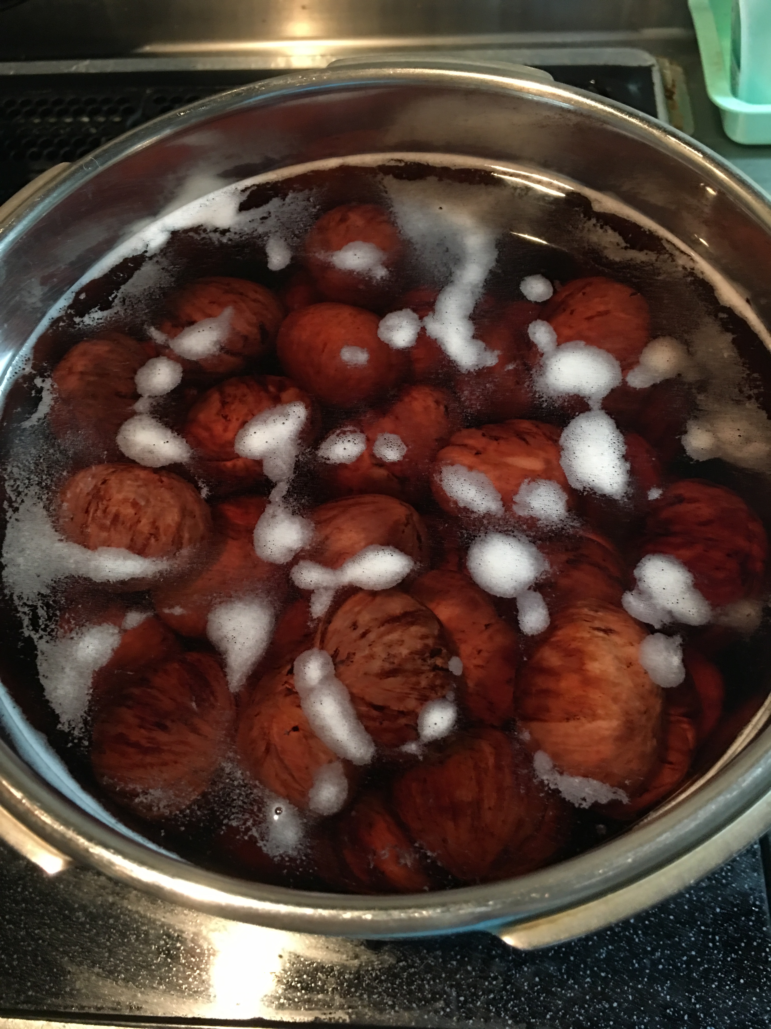 そしてこれをアク抜きしていきます、剥いた栗を鍋に入れて水をはって重曹を入れ、沸騰させます。